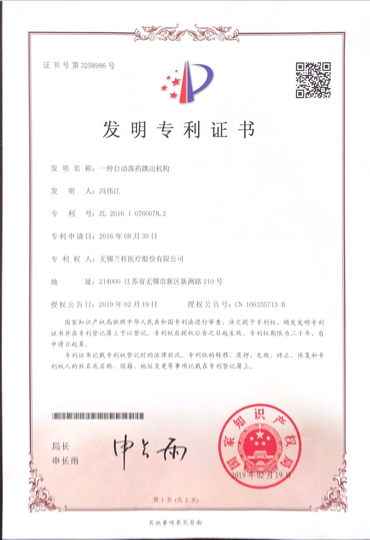 我公司今天又收到一个国家专利局最新发明专利授权,《一种自动落药跳出机构