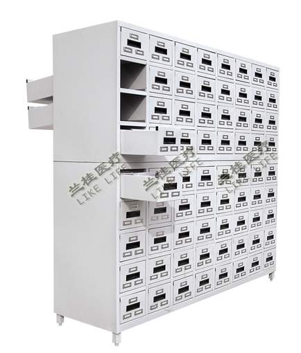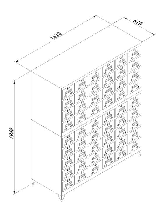 ◆ 分上下两段制作:上段四排八列32个抽屉,下段五排八列40个抽屉,每个抽屉固定隔板分三腔(或塑料斗三个),共放置216味药;