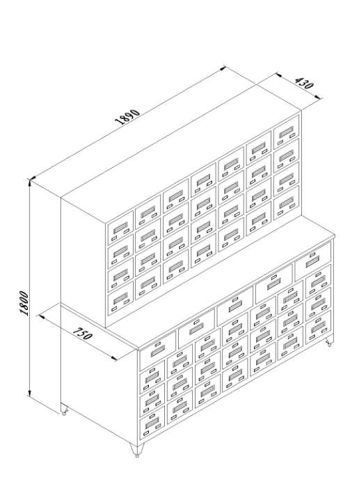 ◆上部小抽屉28个,每抽分隔成2格,下部小抽屉21个,每抽分隔成3格,尺寸:189×233×148;中间大抽屉5个,每个抽屉放1味药,尺寸:350×550×140mm;共放124味药; |