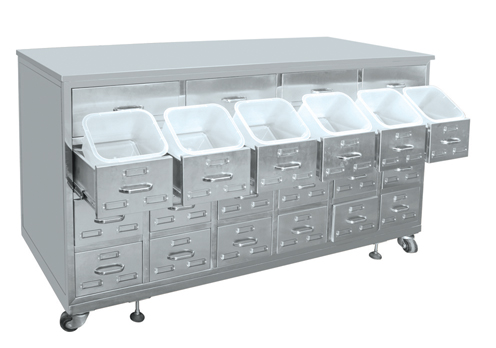 ◆小抽屉18个,每抽分隔成3格,尺寸:189×233×148mm;大抽屉4个,每个抽屉放1味药,尺寸:350×550×140mm;共放58味药;