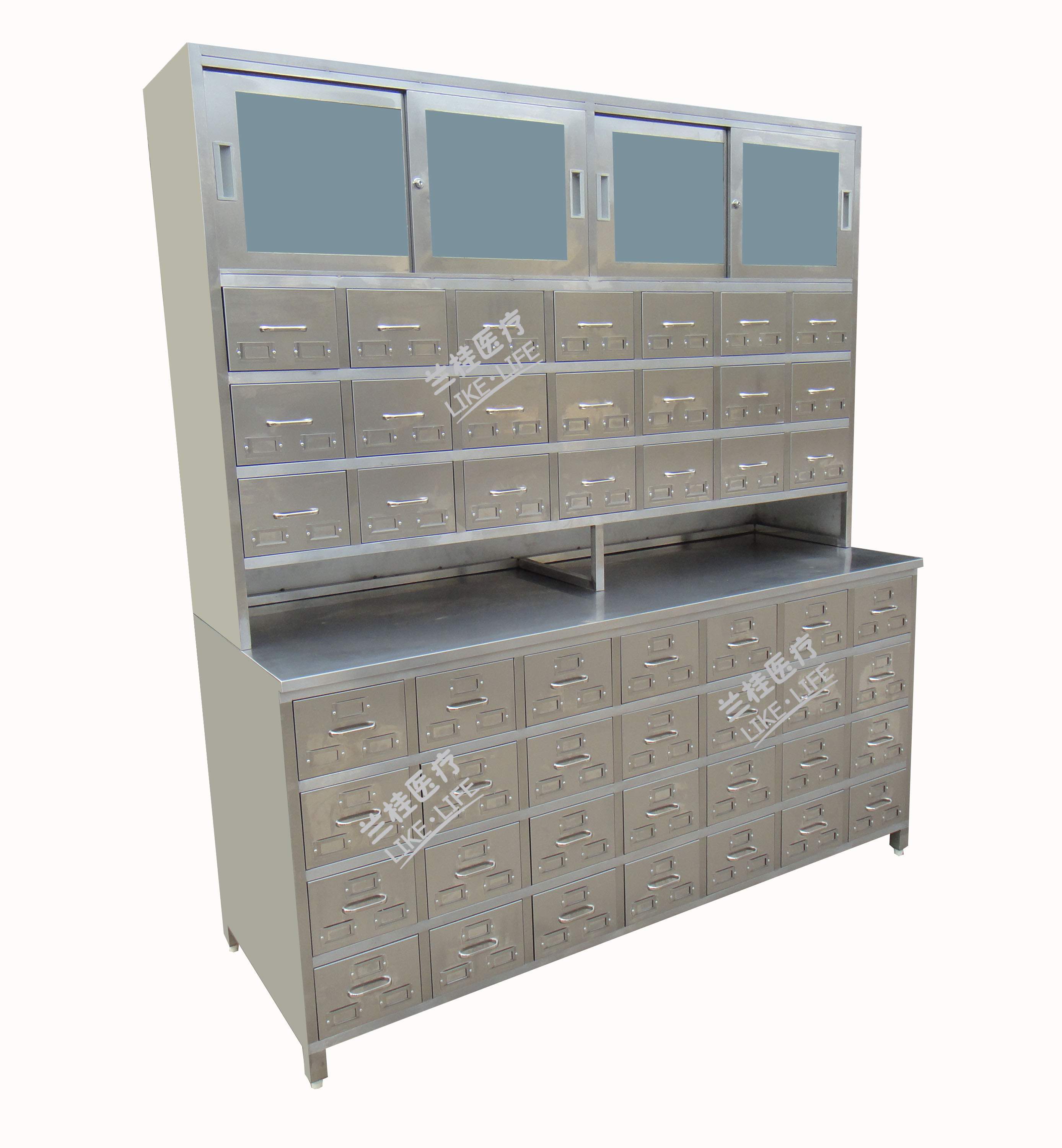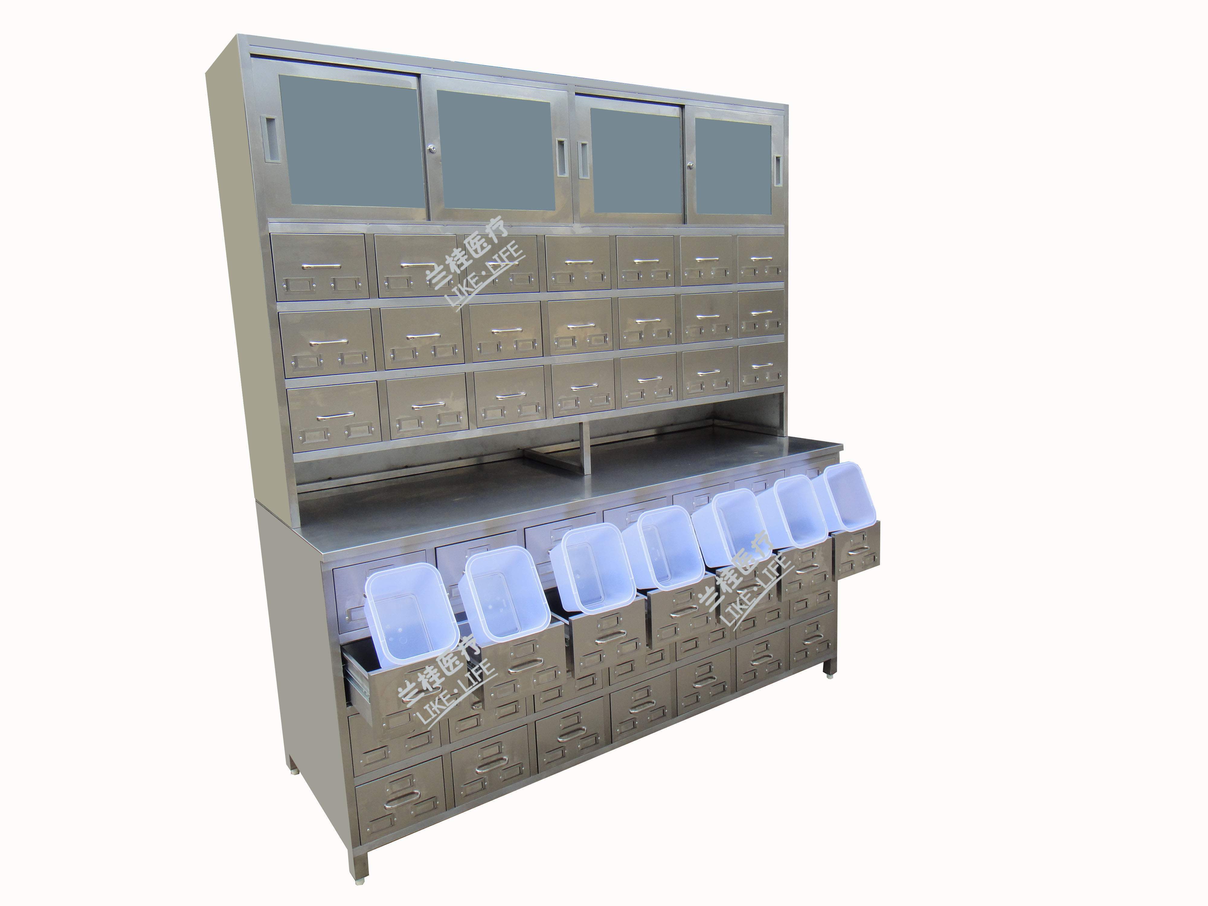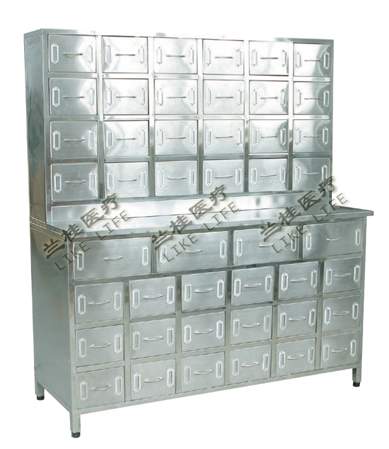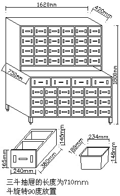 ◆上部小抽屉24个,每抽分隔成2格,下部小抽屉18个,每抽分隔成3格,尺寸:189×233×148mm;中间大抽屉4个,每个抽屉放1味药,尺寸:350×550×140mm;共放106味药; |