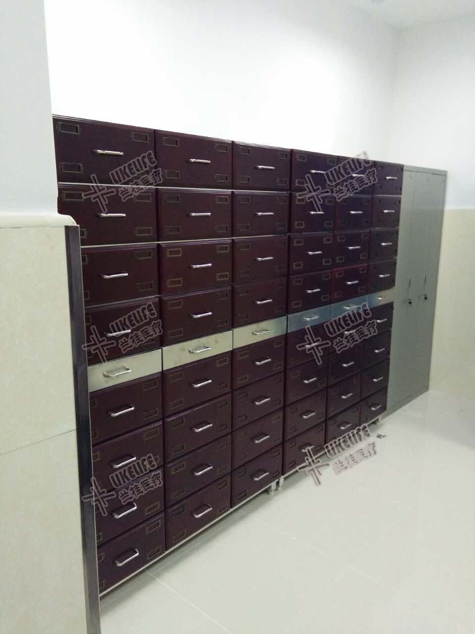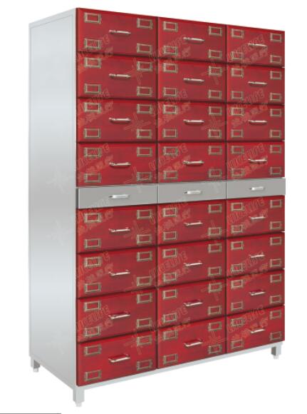 | ◆上下共有24个抽屉,抽屉内胆采用ABS塑料整体制成,每个抽屉内配置四个ABS塑料内盒,内盒尺寸为252×182×152。抽屉面板采用实木制作,表面烤漆,并配有4个药名标签框,中间配置三个不锈钢抽盘; |