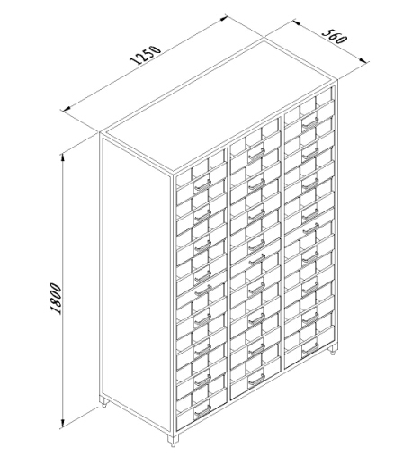 长×宽×高:1250×560×1800mm,抽屉面板为半封式,左右分3格,每格内空为530×118×155mm; |
