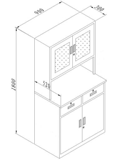 工作台下部2个抽屉,采用防脱三节导轨,下部为对开门。
