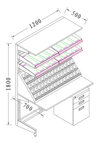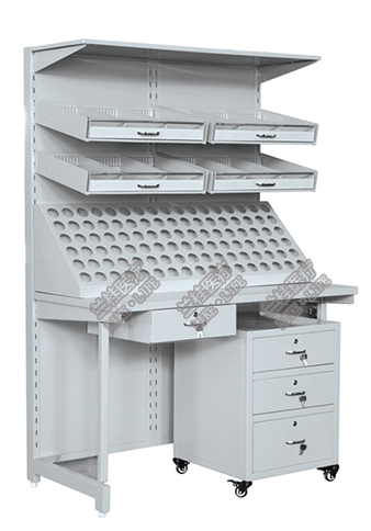 ◆工作台上部配三层两列活动药架和药瓶架,工作台下部配可移动式小柜和抽屉; |