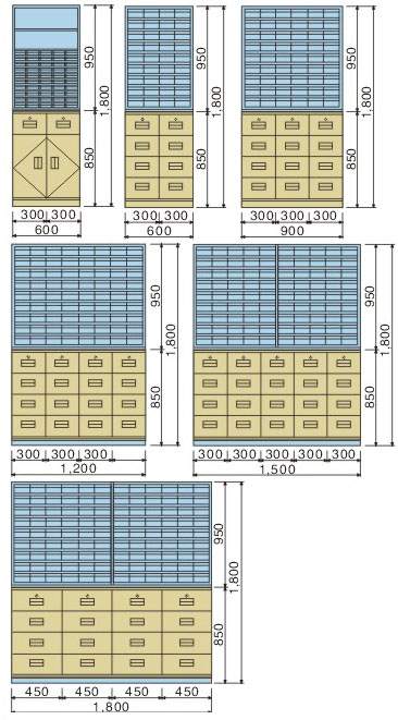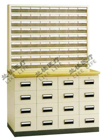 ◆上部采用八层固定隔板,隔板上放置塑料药盒;台面下部为抽屉,配三节抽屉导轨,抽屉锁;