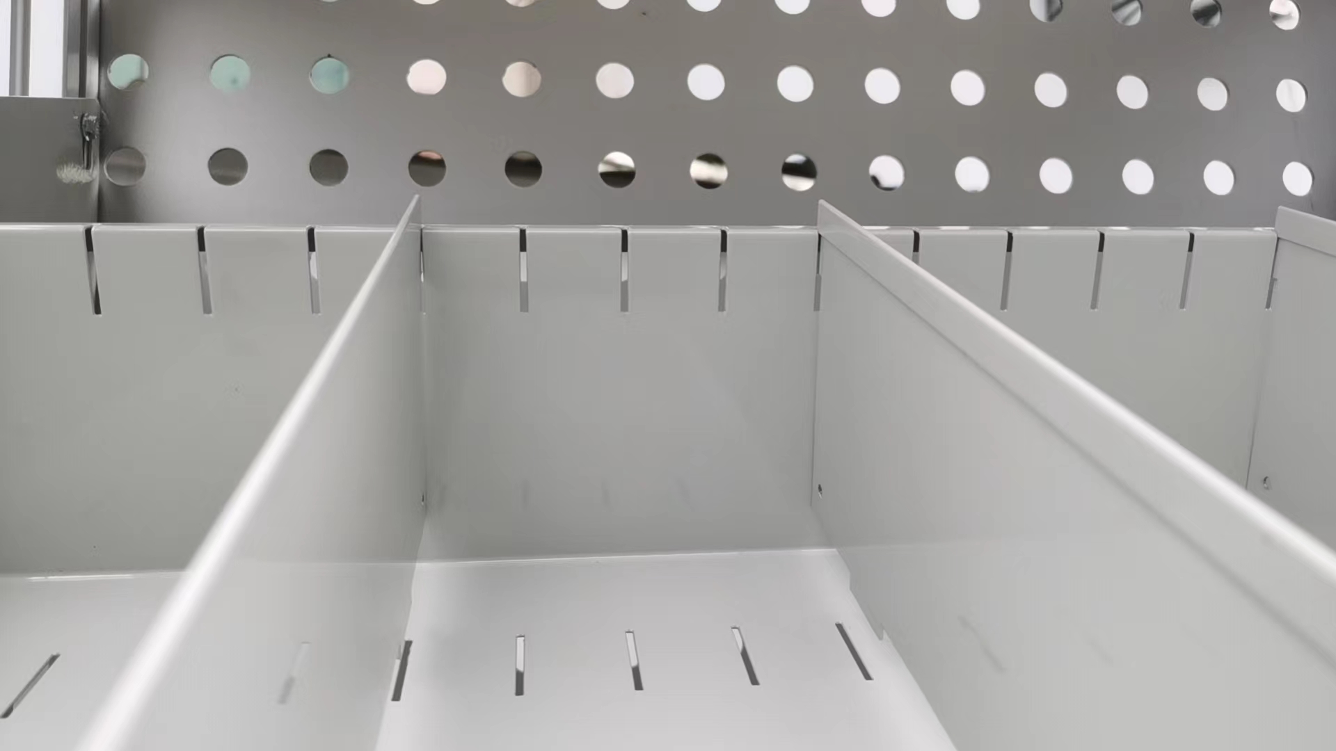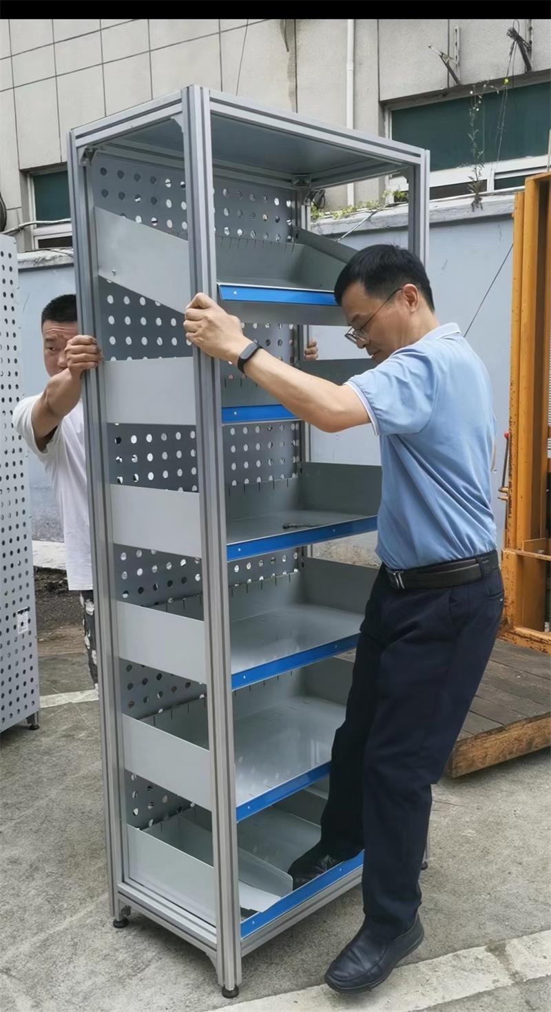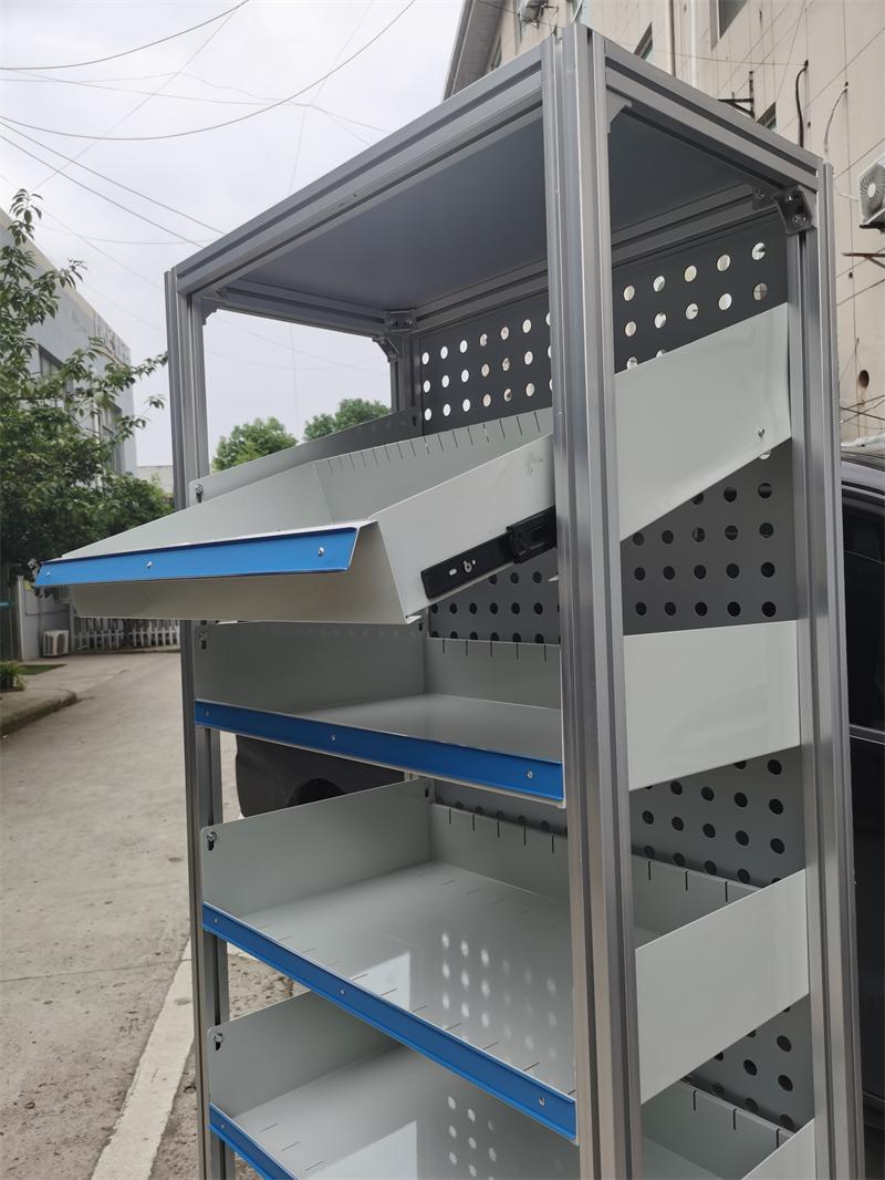 材料:铝合金框架铝塑冲孔半透明背板,冷轧板喷塑药盘,静音轨道